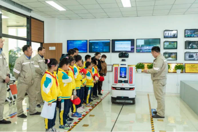 之后,黄国强带九小师生参观了公司生产调度指挥中心、智慧联盟,为师生们介绍了龙王沟煤矿智慧矿山创新成果,让小朋友们深入了解科技创新给矿井安全生产带来的高效便捷,深刻感受机器人的技术魅力,激发了他们对学科学、用科学的浓厚兴趣。